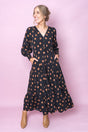 Make a statement in the Franco Dress! It's the perfect choice as a staple for your wardrobe, with its sleek black design and charming tan polka dots. With its eye-catching style and chic silhouette, you'll be feeling confident and looking fabulous!