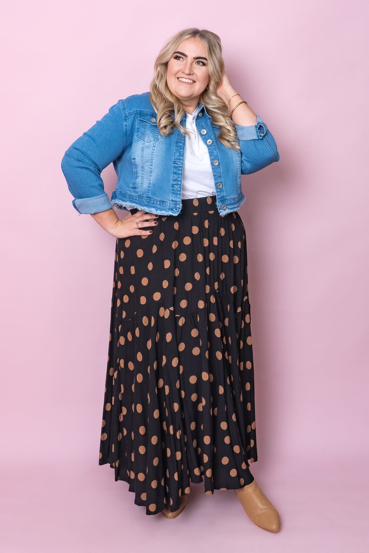 The Toris Skirt is perfect for a classy and chic look. It's made from a lightweight black fabric, and features tan polka dots and a jagged hemline.
