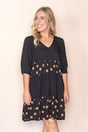 The Wynona Dress brings style and sophistication to any occasion. Crafted with a timeless black base and elegant tan polka dot print, this knee-length dress radiates simple elegance and is sure to turn heads!